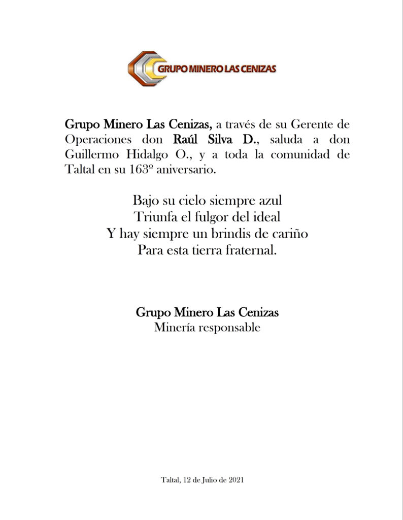Grupo Minero Las Cenizas saluda a la comunidad Taltalina en esta importante fecha, renovando su compromiso por generar bienestar y prosperidad a sus habitantes en armonía con los principios de sustentabilidad de una minería responsable.