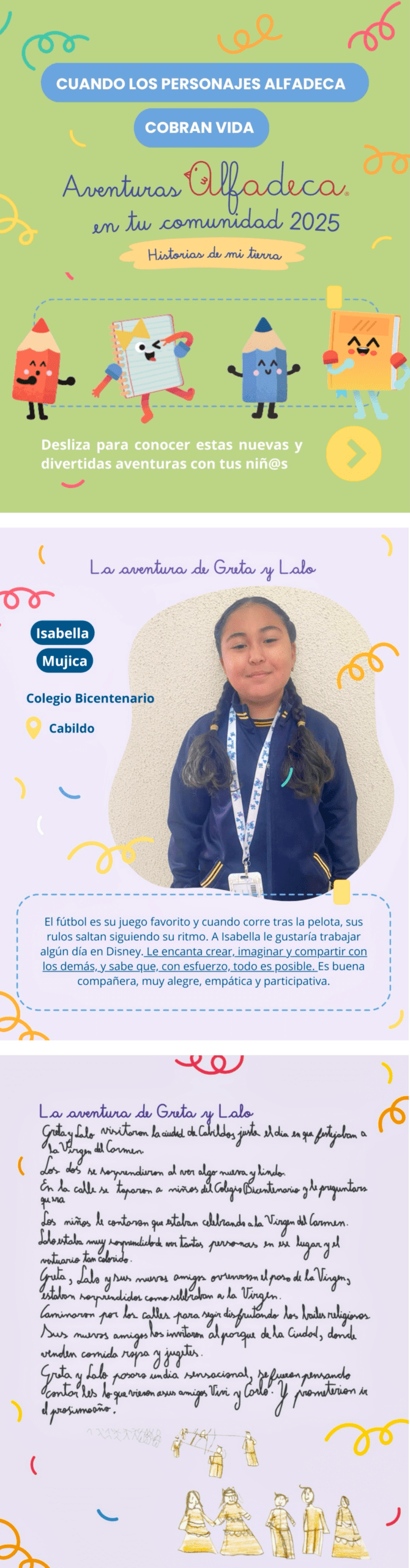 Isabella Mujica Tapia, estudiante de segundo básico del Colegio Bicentenario de Cabildo, fue seleccionada para integrar el libro “Aventuras Alfadeca en tu comunidad 2025: Historias de mi tierra” con su relato “La aventura de Greta y Lalo”, un logro que refleja su talento y evidencia el positivo impacto formativo del programa Alfadeca en su proceso de aprendizaje.