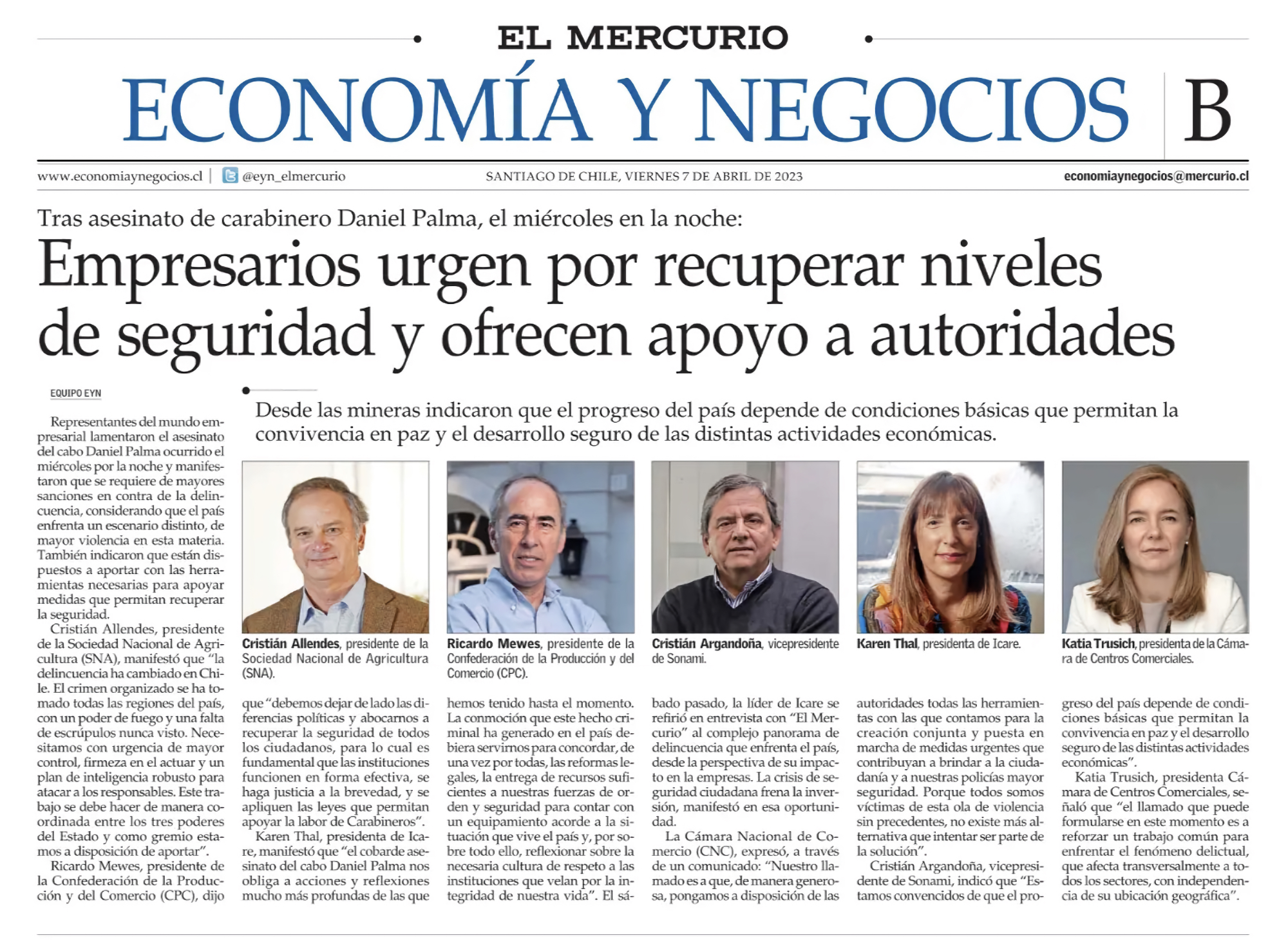 Los dirigentes de la SONAMI, CPC, SNA, CNC, CChC, manifestaron su pesar por la muerte del nuevo martir de carabineros cabo 1° de Carabineros Daniel Palma y llamaron a que «de manera generosa, pongamos a disposición de las autoridades todas las herramientas con las que contamos para la creación conjunta y puesta en marcha de medidas urgentes que contribuyan a brindar a la ciudadanía y a nuestras policías mayor seguridad«.