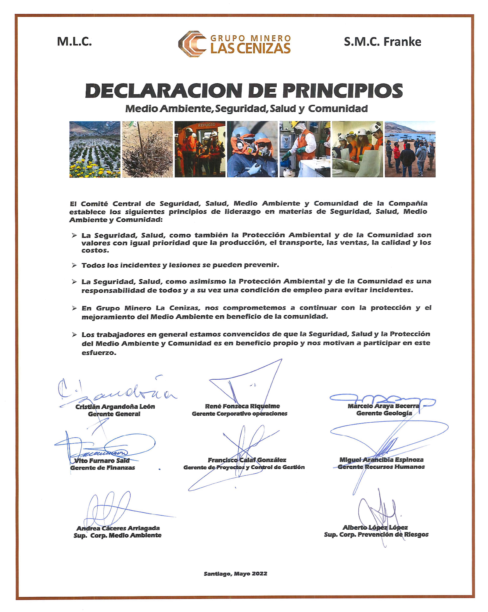 EL «CCSSMAC» ESTABLECE LOS SIGUIENTES PRINCIPIOS DE LIDERAZGO EN MATERIAS DE SEGURIDAD, SALUD, MEDIO AMBIENTE Y COMUNIDAD