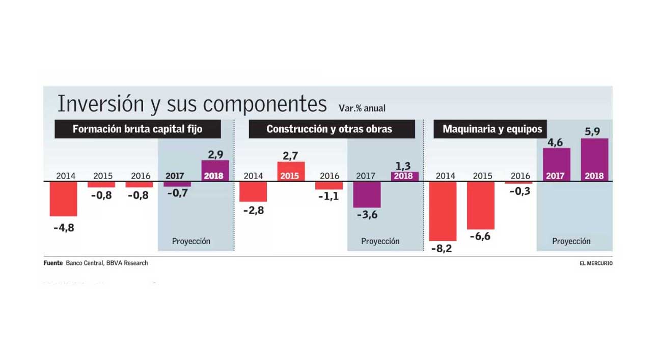 BBVA corrigió levemente a la baja su proyección de inversión en formación bruta de capital fijo desde una caída de -0,5% para 2017 en su estimación previa, a una contracción de -0,7%. Sin embargo, para 2018 anticipa un aumento de 2,9%; esto es, 0,5 puntos porcentuales más que antes.