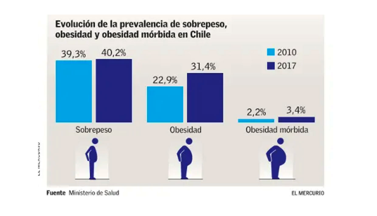 En Chile, el escenario tampoco es alentador: de acuerdo con la última Encuesta Nacional de Salud {ENS) 2016-2017, el 75% de los chilenos mayores de 15 años tiene exceso de peso.