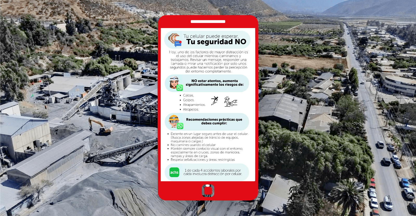 Con esta iniciativa, Minera Las Cenizas Cabildo reafirma su compromiso con la seguridad de cada trabajador y recuerda que uno de cada cuatro accidentes laborales por caída involucra distracción por celular, buscando generar conciencia y fomentar hábitos seguros.