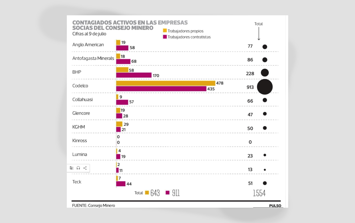 - El gremio de la gran minería informó que al 8 de julio habían 1.554 casos activos. De esos, 643 son trabajadores propios y 911 contratistas. Codelco es la compañía que más trabajadores tiene contagios.