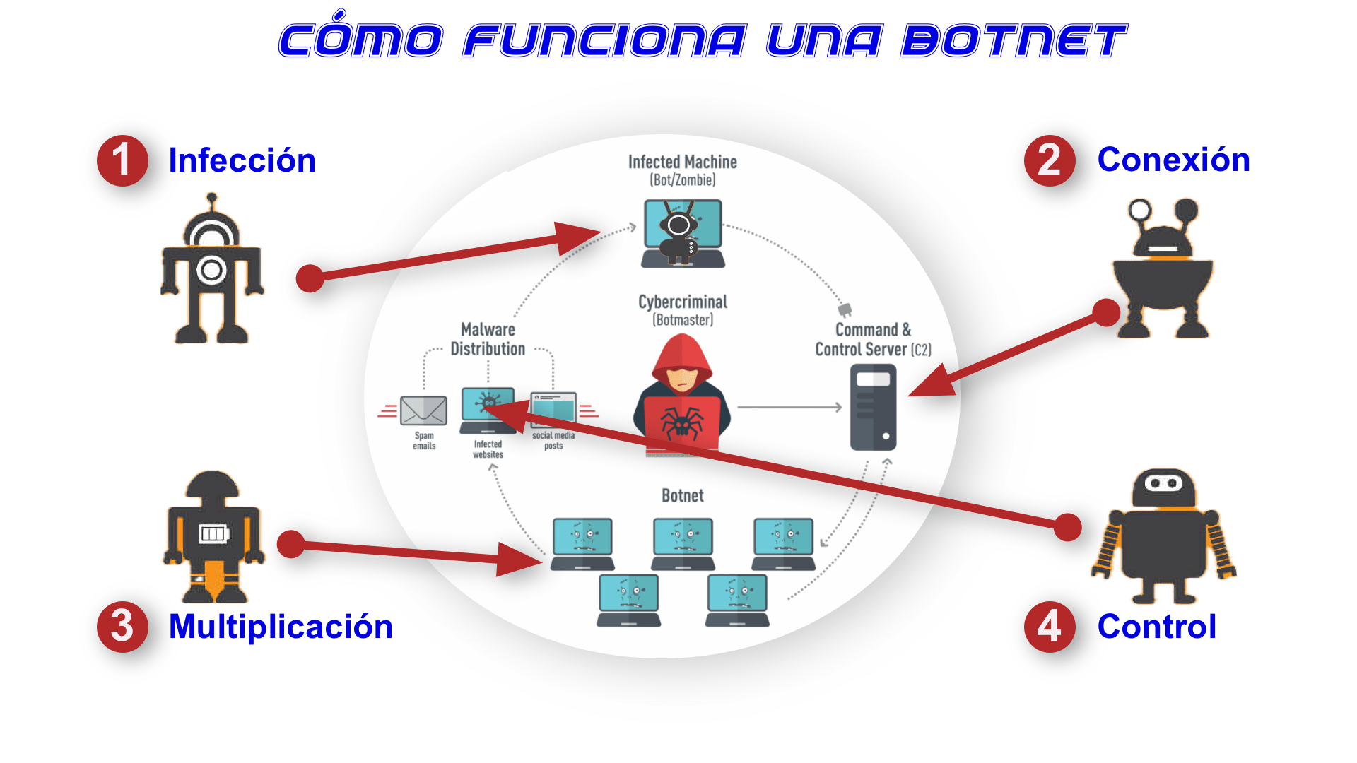 - Ataque: Una vez que los bots están bajo control, el atacante puede orquestar ataques masivos, aprovechando el poder colectivo de millones de dispositivos.