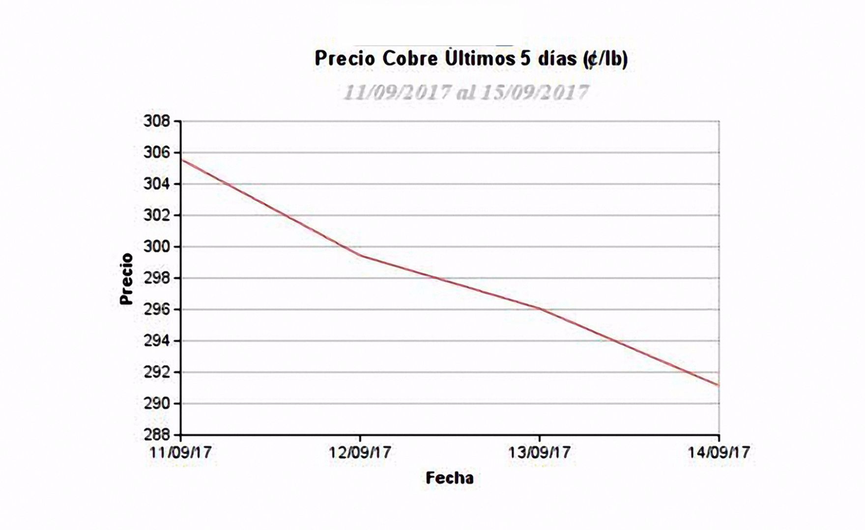 El precio del mineral descendió hoy 1,13% en la Bolsa de Metales de Londres y se cotizó en US$ 2,96 la libra. En las últimas seis jornadas, el principal producto de exportación de Chile acumula un declive de 5,5%.