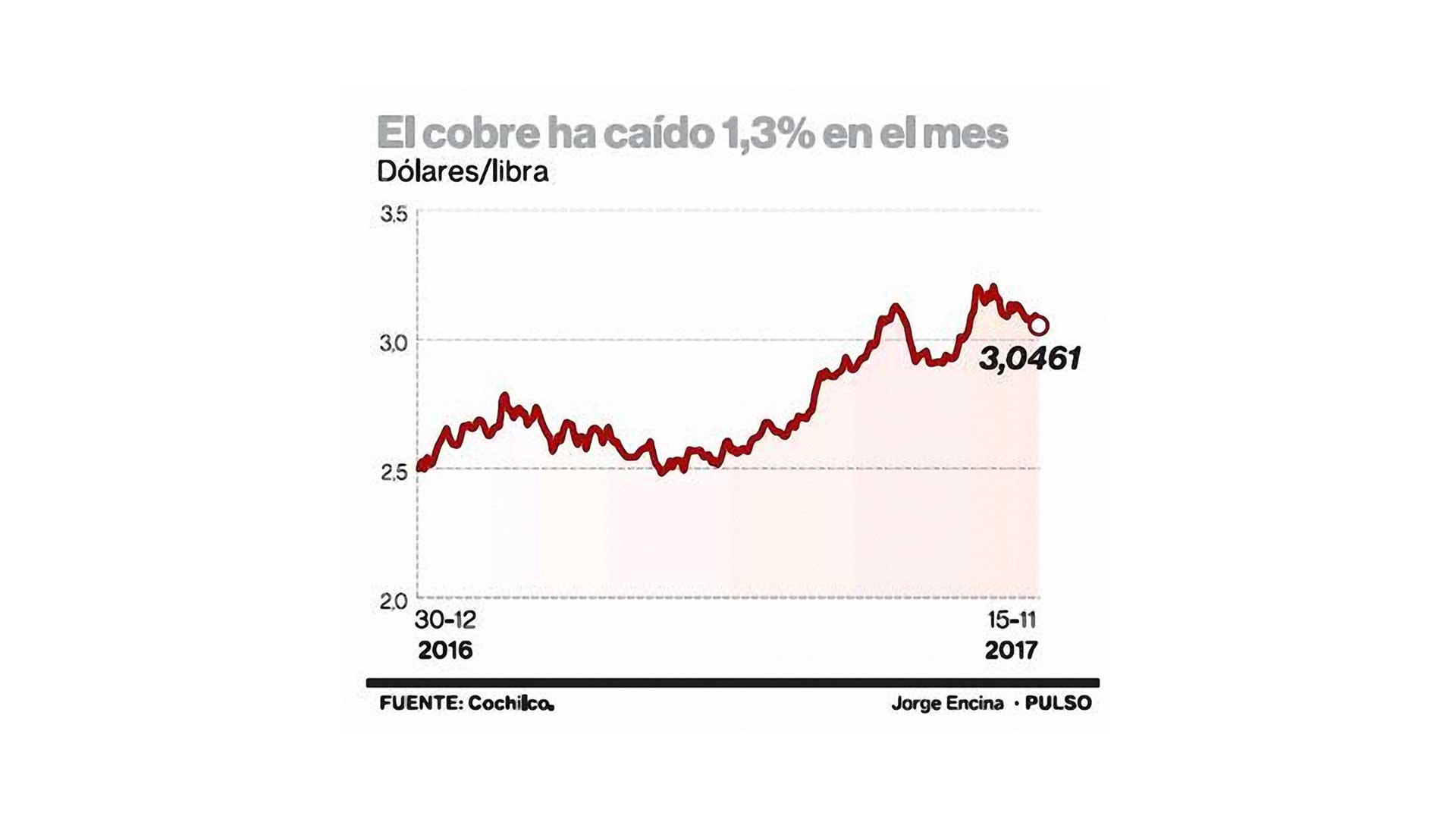 Los futuros del cobre se mantienen sobre los US$3 por libra: los contratos a diciembre de este año cayeron ayer un 1,4% hasta los US$3,0510, mientras que los futuros a diciembre de 2018 bajaron un 1% hasta los US$3,1205.