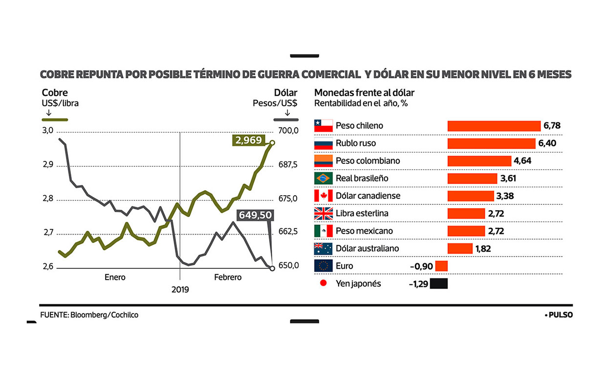 —El conflicto comercial entre Estados Unidos y China está cerca de terminar. Y las reacciones de los mercados y de los commodities no se dejaron esperar: el precio del cobre se acercó a la barrera de los US$3 la libra, cerrando en US$2,96 la libra. Con este incremento, el cobre registró un alza de 9,7% en lo que va del año, con lo que anota su mejor arranque de año desde 2012.