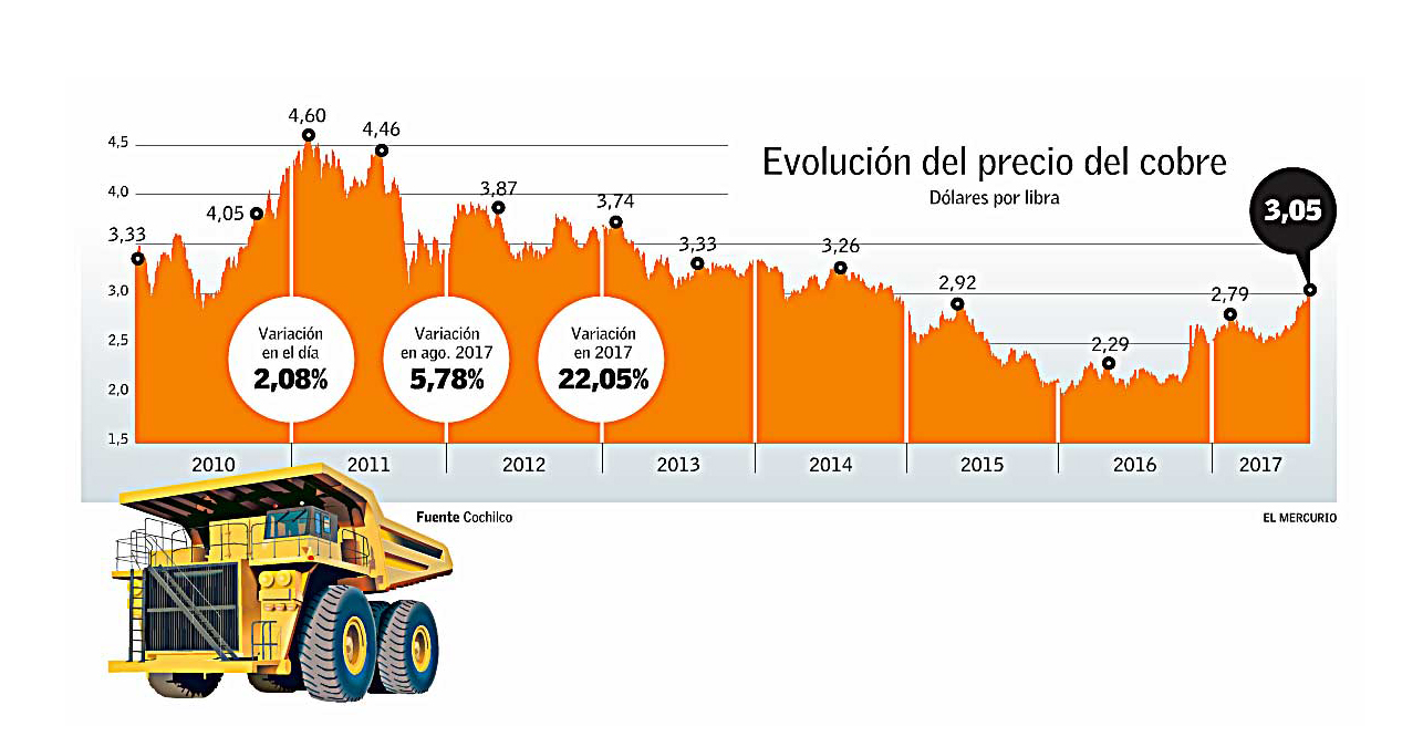 Sin embargo, las discrepancias entre los expertos surgen respecto de si estos precios se mantendrán de aquí a fin de año y en 2018. Gustavo Lagos, director del Centro de Minería de la UC, señaló que el precio actual del metal se mantendrá en el tiempo, pero sin alzas sustantivas. "Está impulsado por dos motivos, uno es la reducción del precio del dólar a nivel internacional, pero también por las expectativas del precio del cobre al mediano plazo", afirmó.