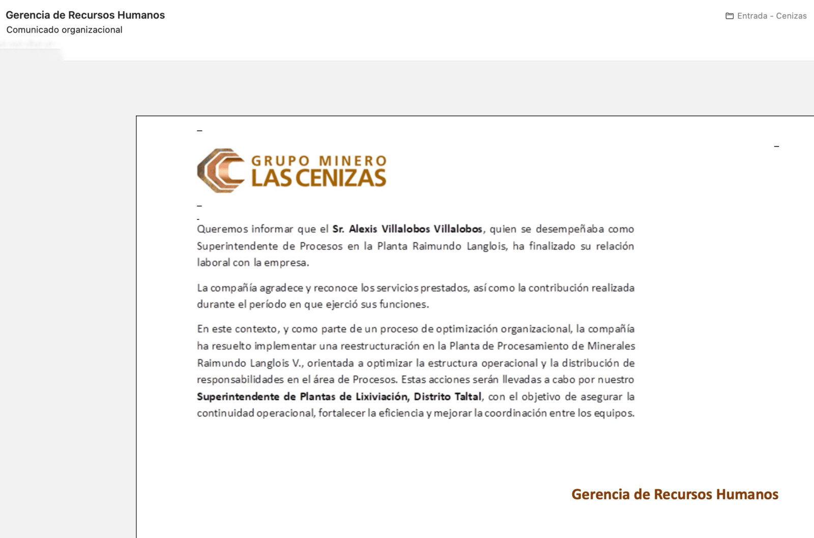 En este contexto, y como parte de un proceso de optimización organizacional, la Compañía ha resuelto implementar una reestructuración en la Planta de Procesamiento de Minerales Raimundo Langlois V., orientada a perfeccionar la estructura operacional y la distribución de responsabilidades en el Área de Procesos.