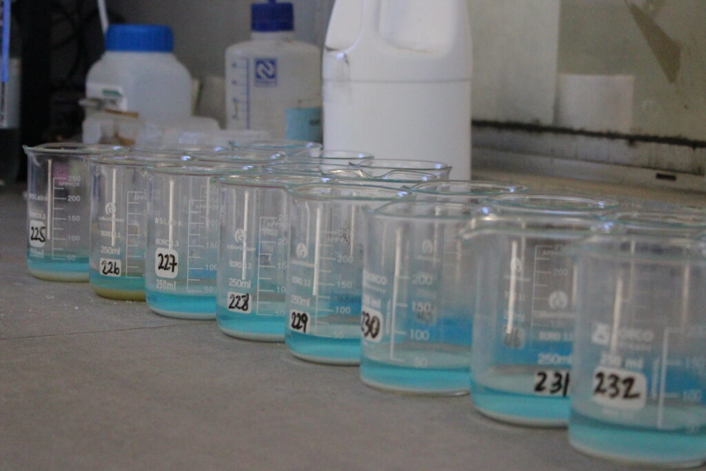 En esta imagen la vemos determinando el porcentaje de cobre por volumetría en muestras. En agosto cumplió ocho meses trabajando y este periodo lo resume como un aprendizaje, agradeciendo la oportunidad que la empresa le entregó de sumarse a las mujeres que se han incorporado al rubro minero.