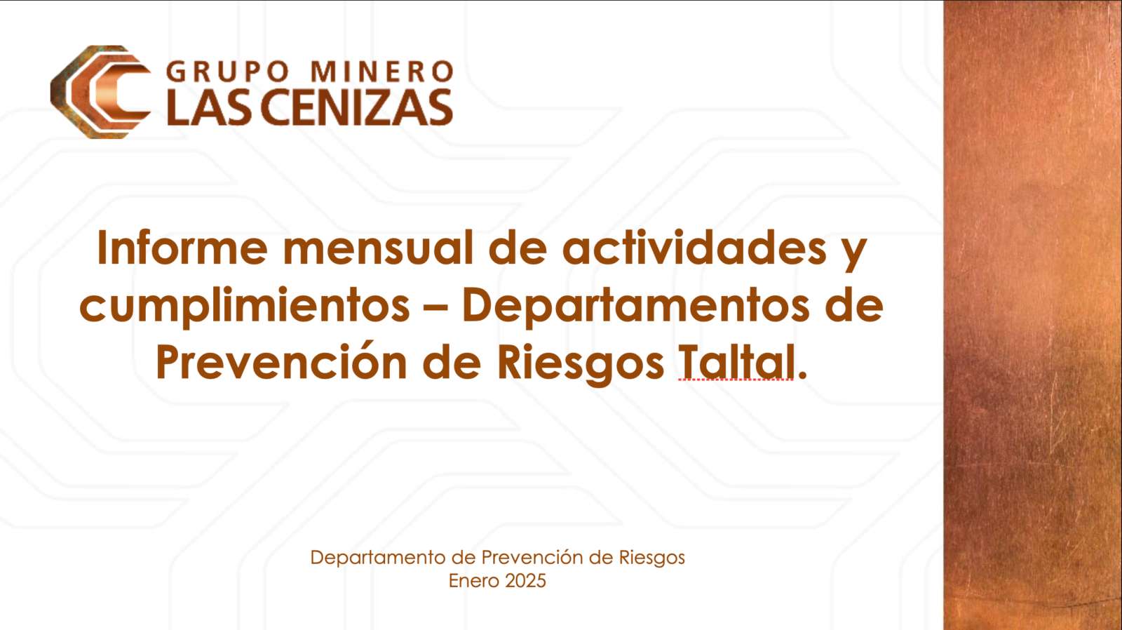 - Reconocimiento y felicitaciones al equipo del Departamento de Prevención de Riesgos de Minera Las Cenizas Taltal y a todo el personal directo y colaboradores por la excelente labor en el control de riesgos mineros durante el año 2024.