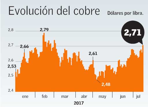 El cobre alcanzó ayer su valor más alto en cuatro meses y medio, al cerrar en US$ 2,71 la libra, cifra que no alcanzaba desde el dos de marzo de este año, cuando el metal se cotizó en US$ 2,72 en la Bolsa de Metales de Londres. En la jornada, registró un incremento de 1,84% en relación al precio en que se cotizó el viernes, el mayor aumento diario desde mayo de este año.