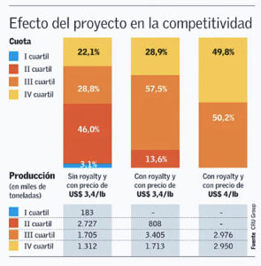 Un ejercicio realizado por el CRU Group, en el que se detalla cómo afecta el royalty al CRU Cash Cost (indicador similar al costo de caja C1 ), en el que se precisa el fuerte impacto en la competitividad. A modo de ejemplo, con el royalty operativo y el cobre a US$ 4, la totalidad de la producción chilena se ubicaría entre el tercer y cuarto cuartil de costos.