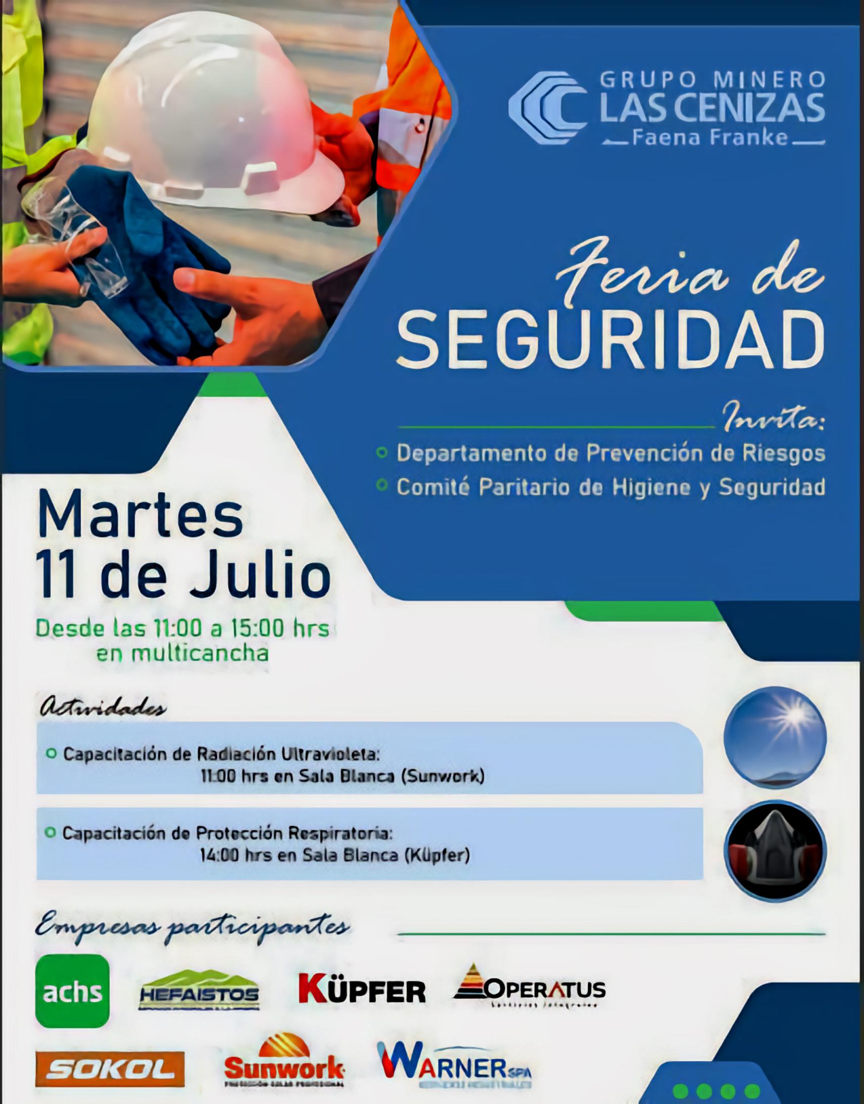 Proveedores de equipos de protección personal y empresas colaboradoras exhibirán una muestra con los nuevos adelantos para equipos de seguridad y cuidado personal, con el fin de aportar información práctica de los estándares de seguridad y la cada vez más relevante implicancia del autocuidado y mutuo cuidado para evitar accidentes en faenas mineras.
