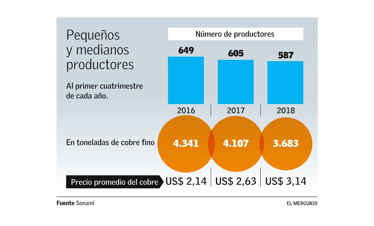 Prueba de esto, es que en los últimos dos años el número de mineros que le vende cobre a la Empresa Nacional de Minería (Enami) ha caído fuertemente, pasando de los 649 vistos en el período enero-abril de 2016, a 587 en el mismo período de este ejercicio.