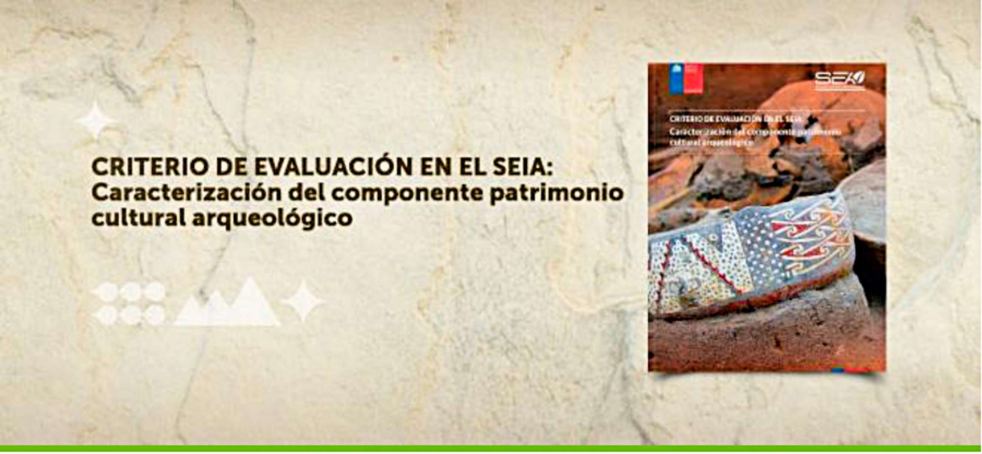 - Bajo el título «Criterio de Evaluación en el SEIA: Caracterización del componente patrimonio cultural arqueológico», el Servicio de Evaluación Ambiental ha publicado un documento cuyo objetivo es que los titulares de proyectos definan los contenidos necesarios para la caracterización del patrimonio cultural arqueológico antes de ingresar al SEIA.