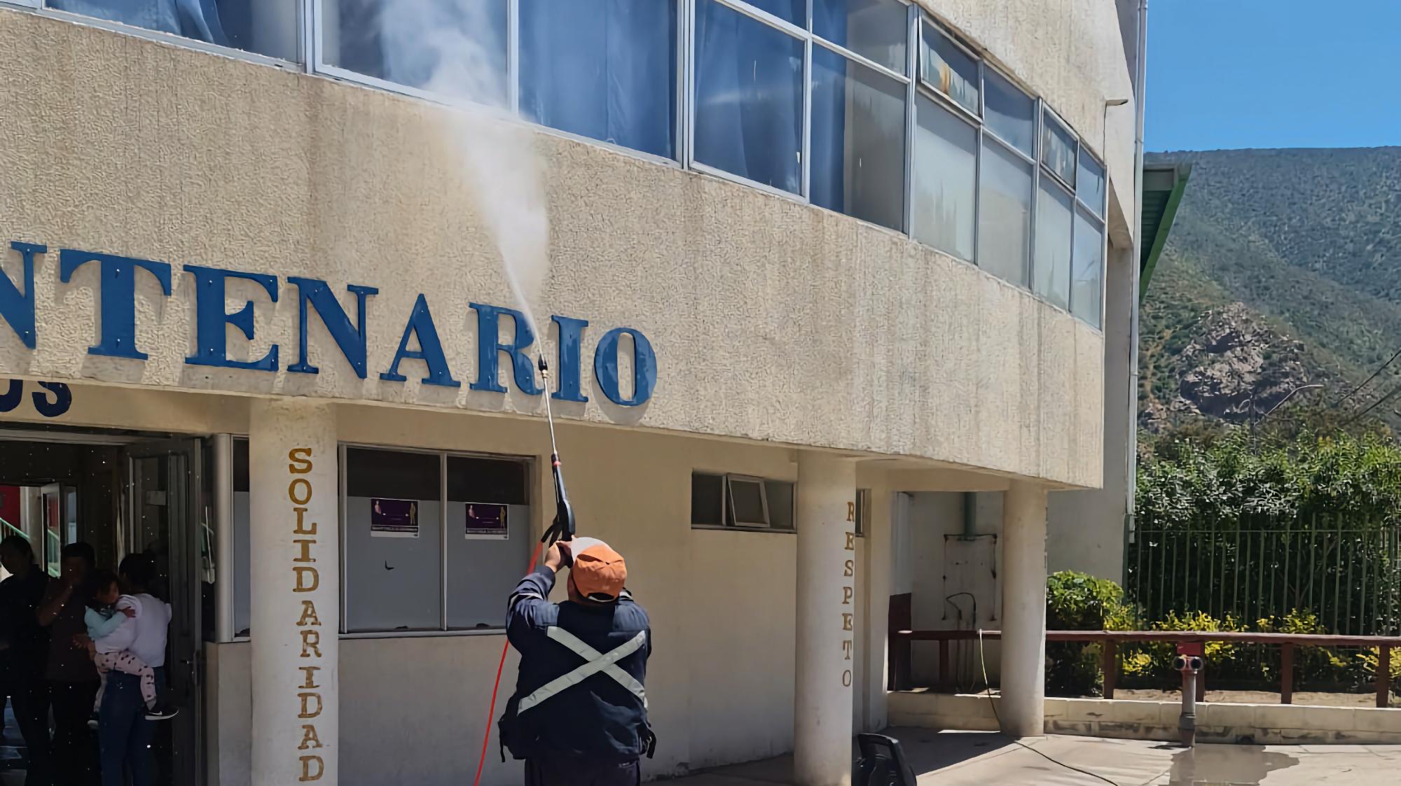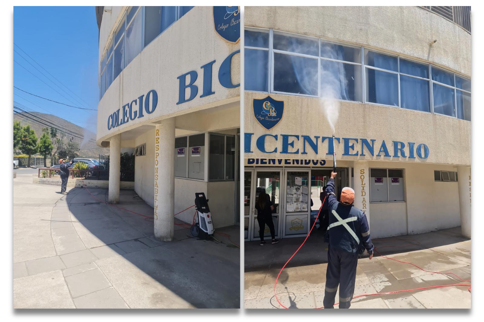 Personal de empresa colaboradora asistió al Colegio Bicentenario, ubicado frente a Casa de Comunidades, para realizar limpieza de ventanas con hidrolavadora que se encuentran a una altura difícil de acceder.