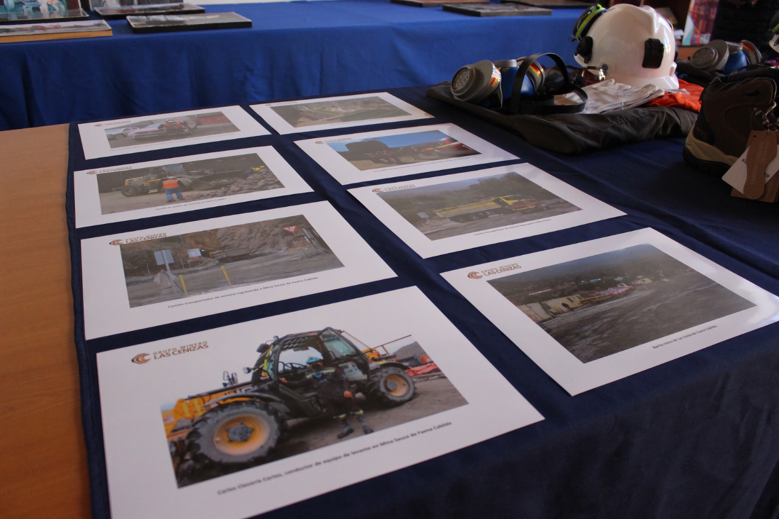 Entre los expositores, faena Cabildo exhibe un espacio compuesto por elementos de protección personal esenciales para la labor minera; registros fotográficos del trabajador Cenizas y de las instalaciones de la faena.