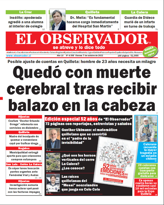 El pasado viernes 7 de octubre, el Diario El Observador publicó su edición especial en el marco de los 52 años de historia que cumplió la empresa periodística, informando a las y los habitantes de las provincias de Quillota, San Felipe, Los Andes, Petorca, Marga Marga y Valparaíso.