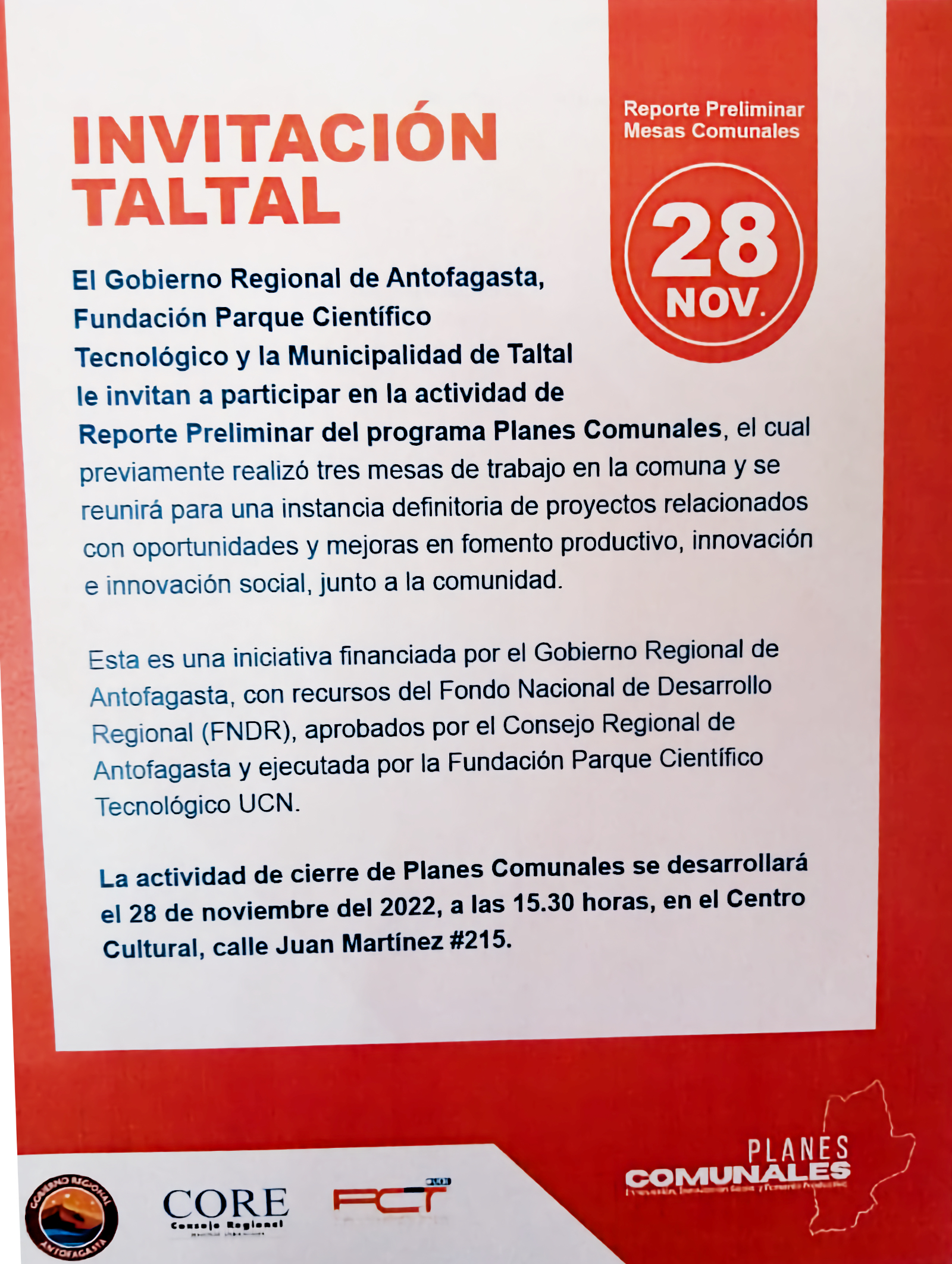 El Reporte Preliminar del Programa Planes Comunales es una instancia financiada por el Gobierno Regional de Antofagasta, con recursos del Fondo Nacional de Desarrollo Regional (FNDR), aprobado por el Consejo Regional de Antofagasta y ejecutada por la Fundación Parque Científico Tecnológico UCN.