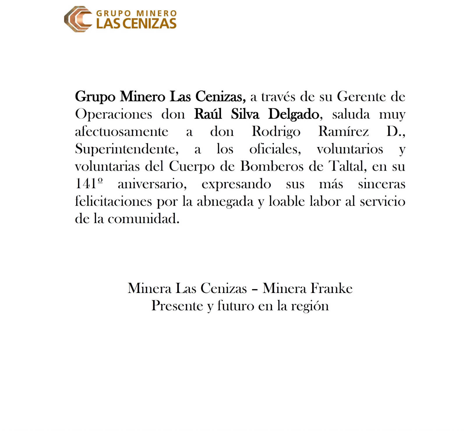Con motivo de esta importante fecha, Grupo Minero Las Cenizas, a través de nuestro Gerente de Operaciones, Raúl Silva Delgado, saludó muy afectuosamente a don Rodrigo Ramírez, Superintendente de Bomberos de Taltal, a los oficiales, voluntarios y voluntarias del Cuerpo de Bomberos de Taltal, en su aniversario, expresando nuestras más sinceras felicitaciones por la abnegada y loable labor al servicio de la comunidad.