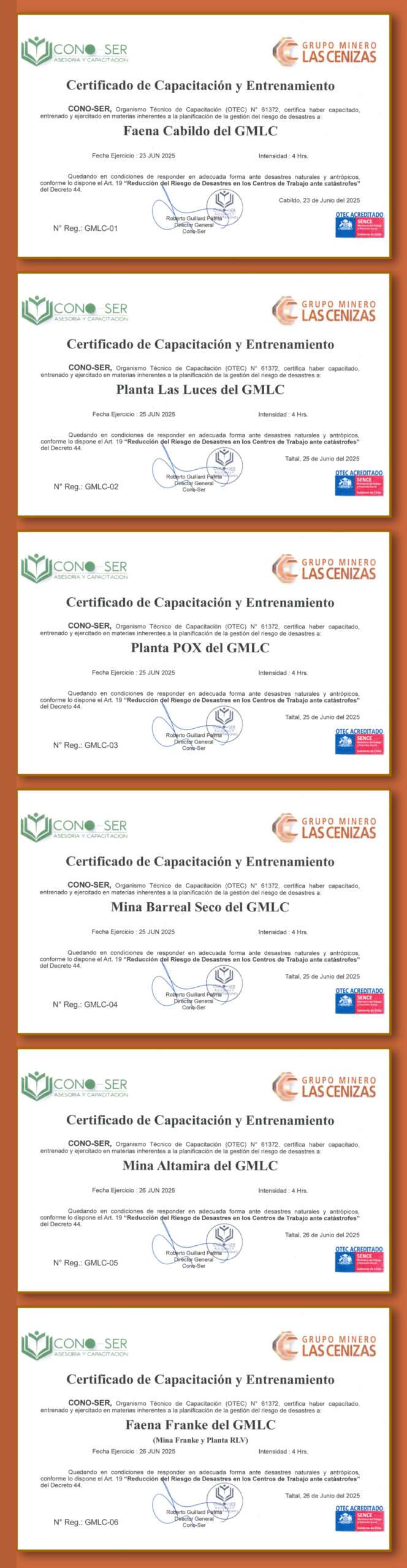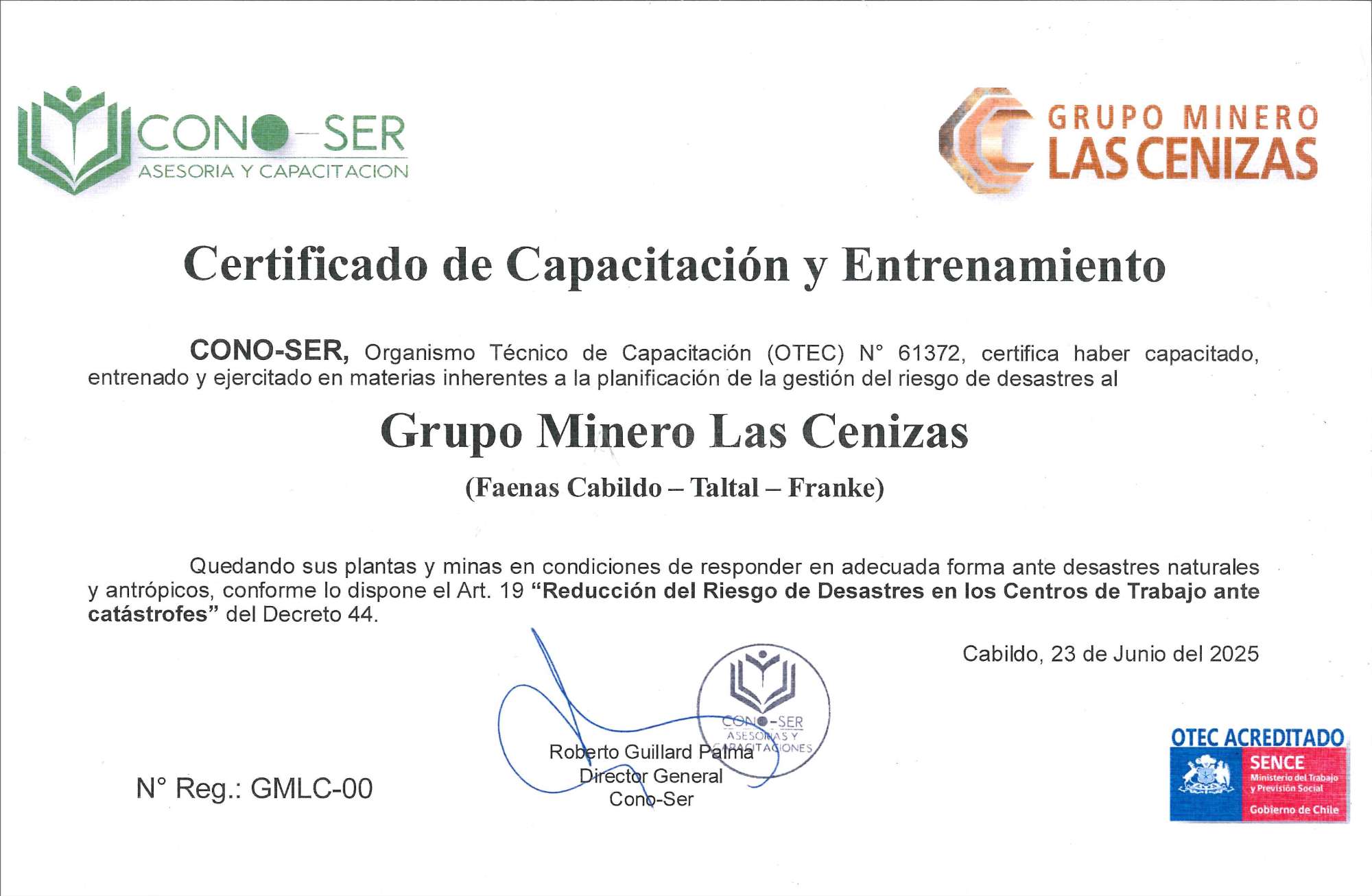 Con esta certificación obtenida a través de la empresa CONO-SER, acreditada por SENCE, las jefaturas, supervisores, integrantes de los equipos DPR (Detección, Prevención y Respuesta) y brigadistas de rescate de minas y plantas, quedan formalmente capacitados para actuar ante desastres naturales o de origen antrópico, conforme a lo establecido en el Artículo 19 del Decreto 44 sobre “Reducción del Riesgo de Desastres en los Centros de Trabajo ante catástrofes”.