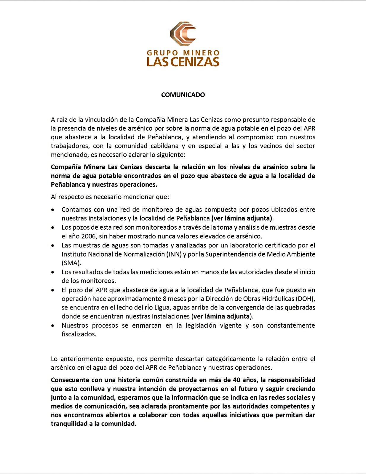 Es nuestro deber y responsabilidad con nuestros trabajadores, con la comunidad de Cabildo en general y Peñablanca en particular, informar públicamente que descartamos cualquier tipo de relación entre dichos niveles de arsénico en el agua y nuestras operaciones en Cabildo.
