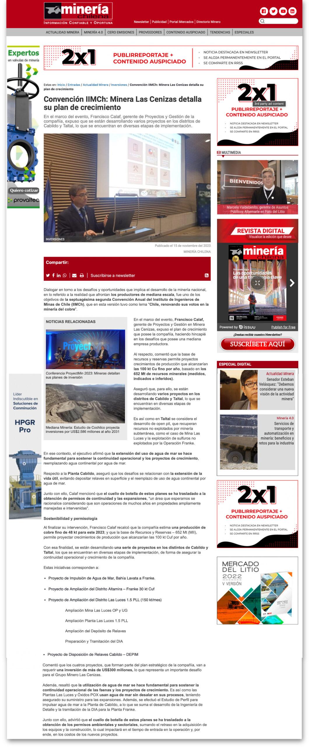 Al finalizar su intervención, Francisco Calaf recalcó que la compañía estima una producción de cobre fino de 48 kt para este 2023; y que la base de Recursos y Reservas – 652 Mt (MII), permite proyectar crecimientos de producción que alcanzarían las 100 kt Cuf por año.