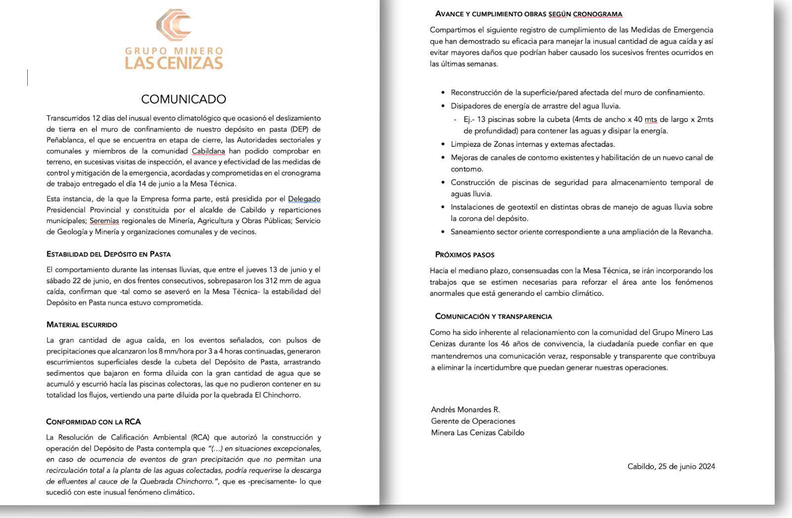 cabildo empresa medioambiente GMLC en la Prensa admin junio 27, 2024 Publicaciones en medios digitales, entre el 24 y el 27 de junio, del Tercer Comunicado de Prensa sobre el deslizamiento en el DEP de faena Cabildo. Post Views: 600 Compartir artículo:
