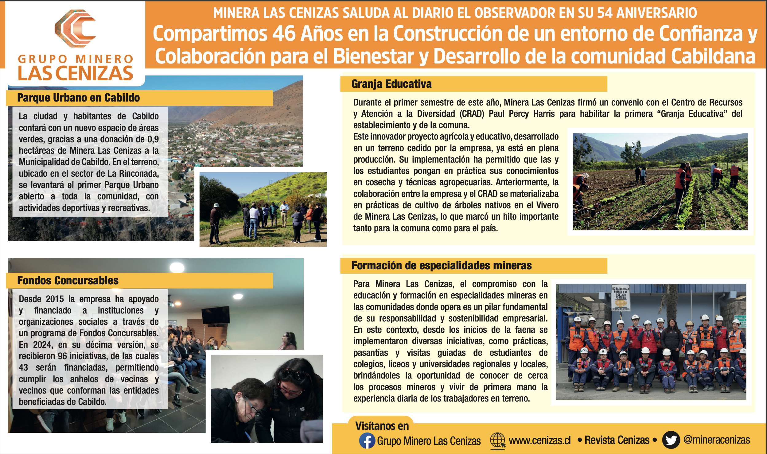 - El Grupo Minero Las Cenizas saludó al Diario El Observador de la V Región por sus 54 años de trayectoria informando a la comunidad.