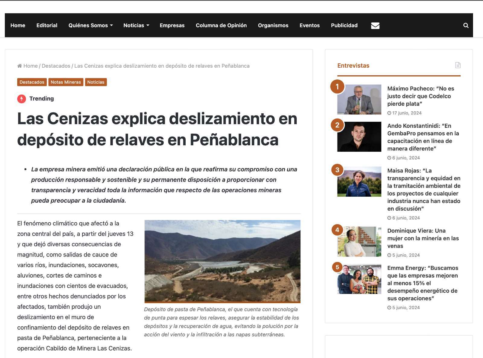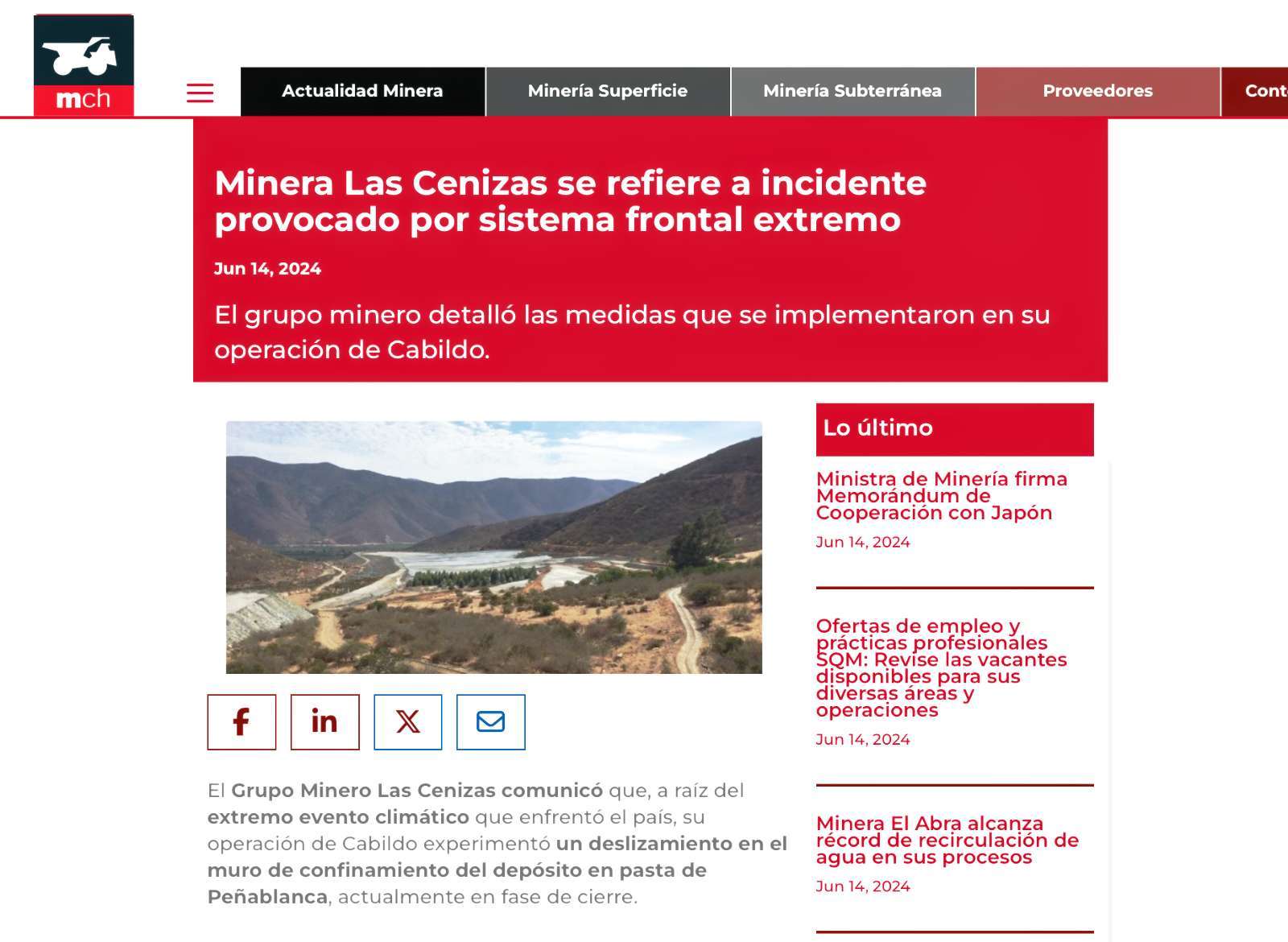 Minera Las Cenizas se refiere a incidente provocado por sistema frontal extremo