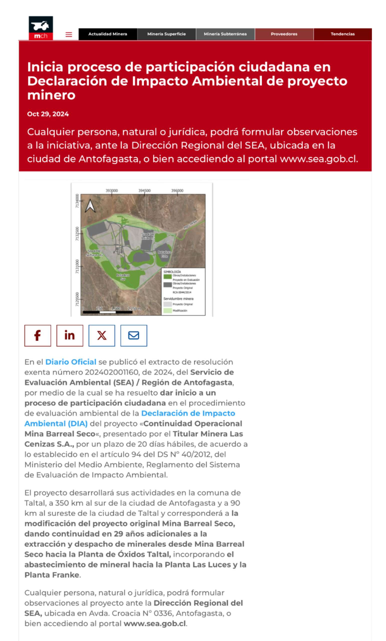 El Servicio de Evaluación Ambiental (SEA) en la Región de Antofagasta ha iniciado un proceso de participación ciudadana en la evaluación ambiental de la Declaración de Impacto Ambiental (DIA) del proyecto minero «Continuidad Operacional Mina Barreal Seco», propuesto por Minera Las Cenizas S.A.