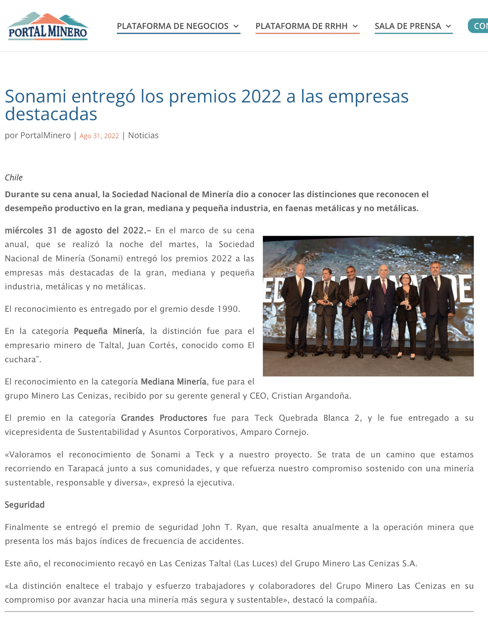 En la ceremonia que enmarca la Cena Anual de SONAMI y que contó con la presencia del Presidente de la República y un impresionante marco de público, el Grupo Minero Las Cenizas fue distinguido con los más importantes Premios que otorga anualmente la Sociedad Nacional de Minería.