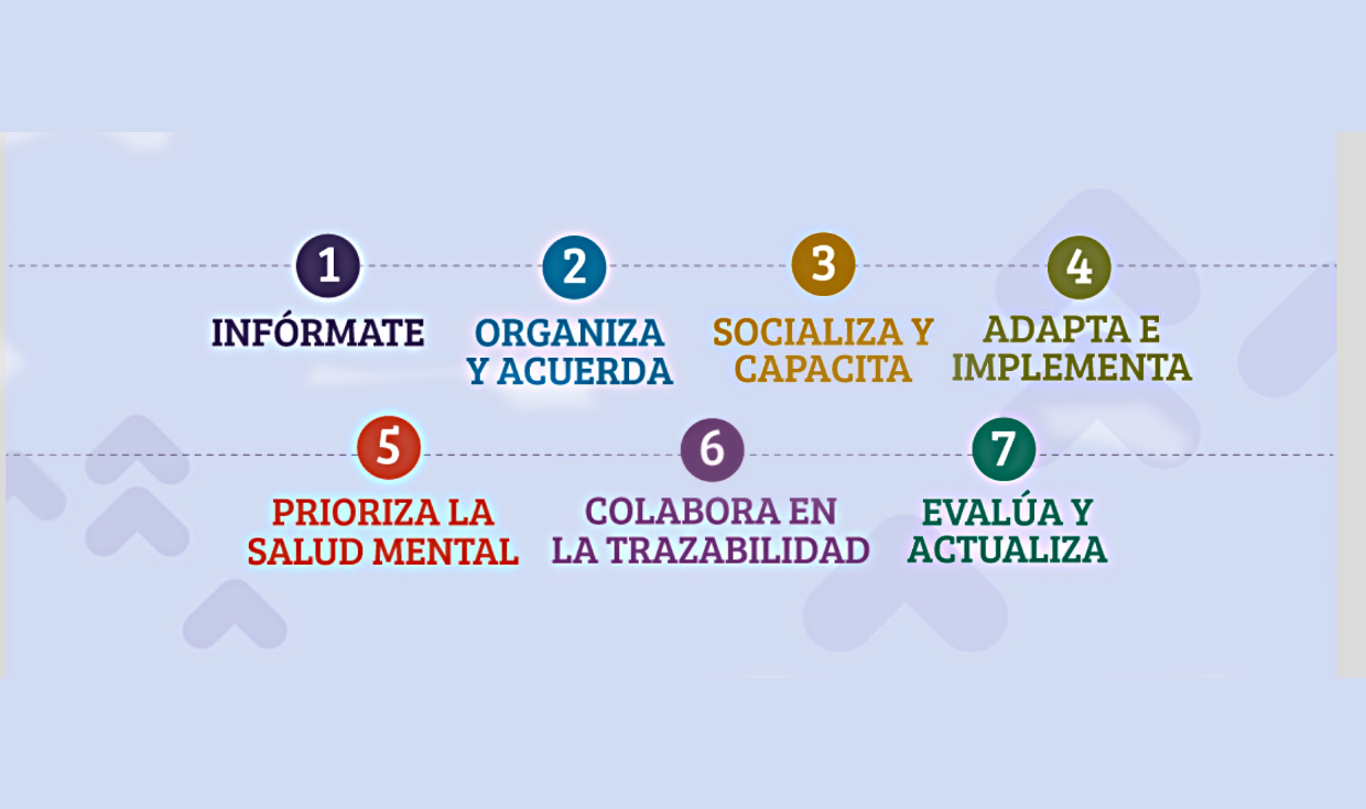 La "hoja de ruta" contempla 7 etapas: Infórmese, Organice y Acuerde, Socialice y Capacite, Adapte e Implemente, Priorice la Salud Mental, Colabore en la Trazabilidad y Evalúe y Actualice.
