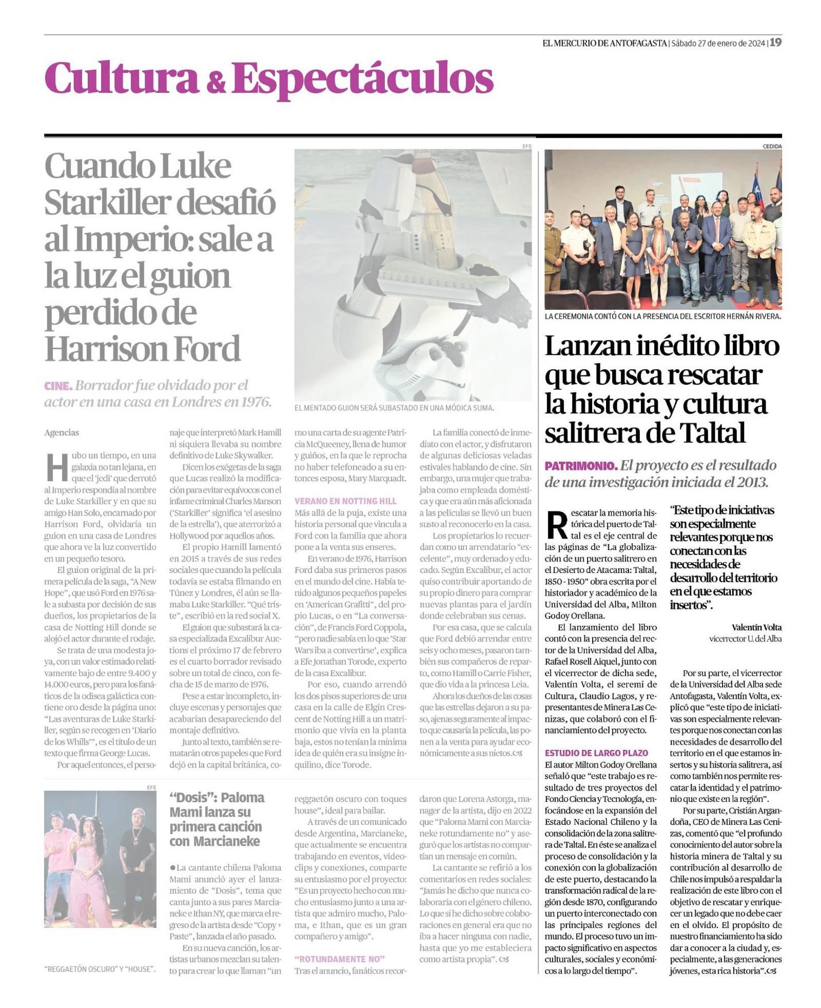 La presentación oficial del libro tuvo lugar el viernes 26 de enero en el Auditorio de El Mercurio de Antofagasta, siendo un evento que congregó a destacadas personalidades. Christian Lagos, Superintendente de Administración de Faena Taltal, representó a Minera Las Cenizas en este acto que busca destacar y promover la cultura y la historia local.