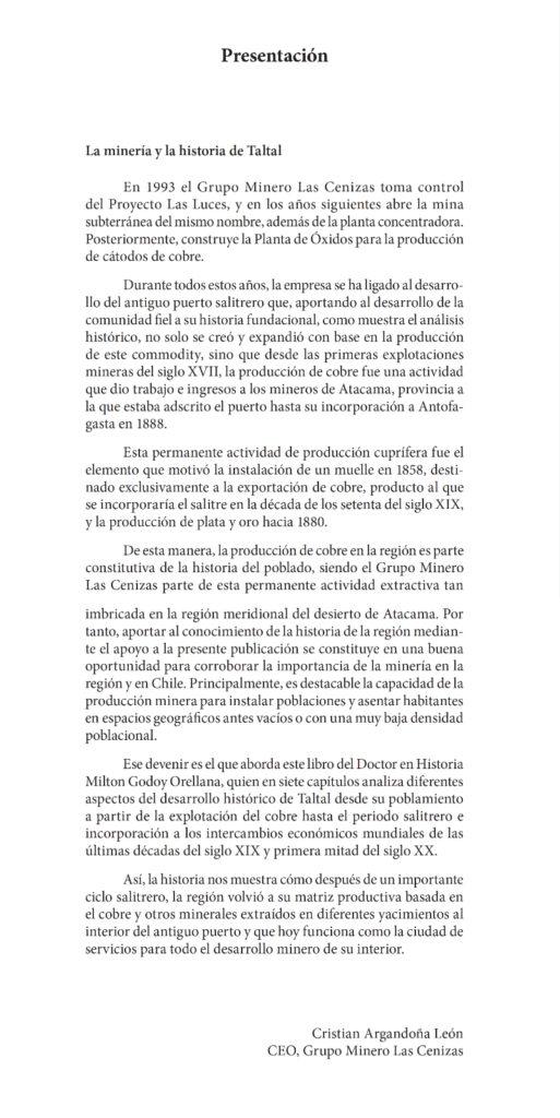 Ese devenir es el que aborda este libro del Doctor en Historia Milton Godoy O rellana, quien en siete capítulos analiza diferentes aspectos del desarrollo histórico de Taltal desde su poblamiento a partir de la explotación del cobre hasta el periodo salitrero e incorporación a los intercambios económicos mundiales de las últimas décadas del siglo XIX y primera mitad del siglo XX.
