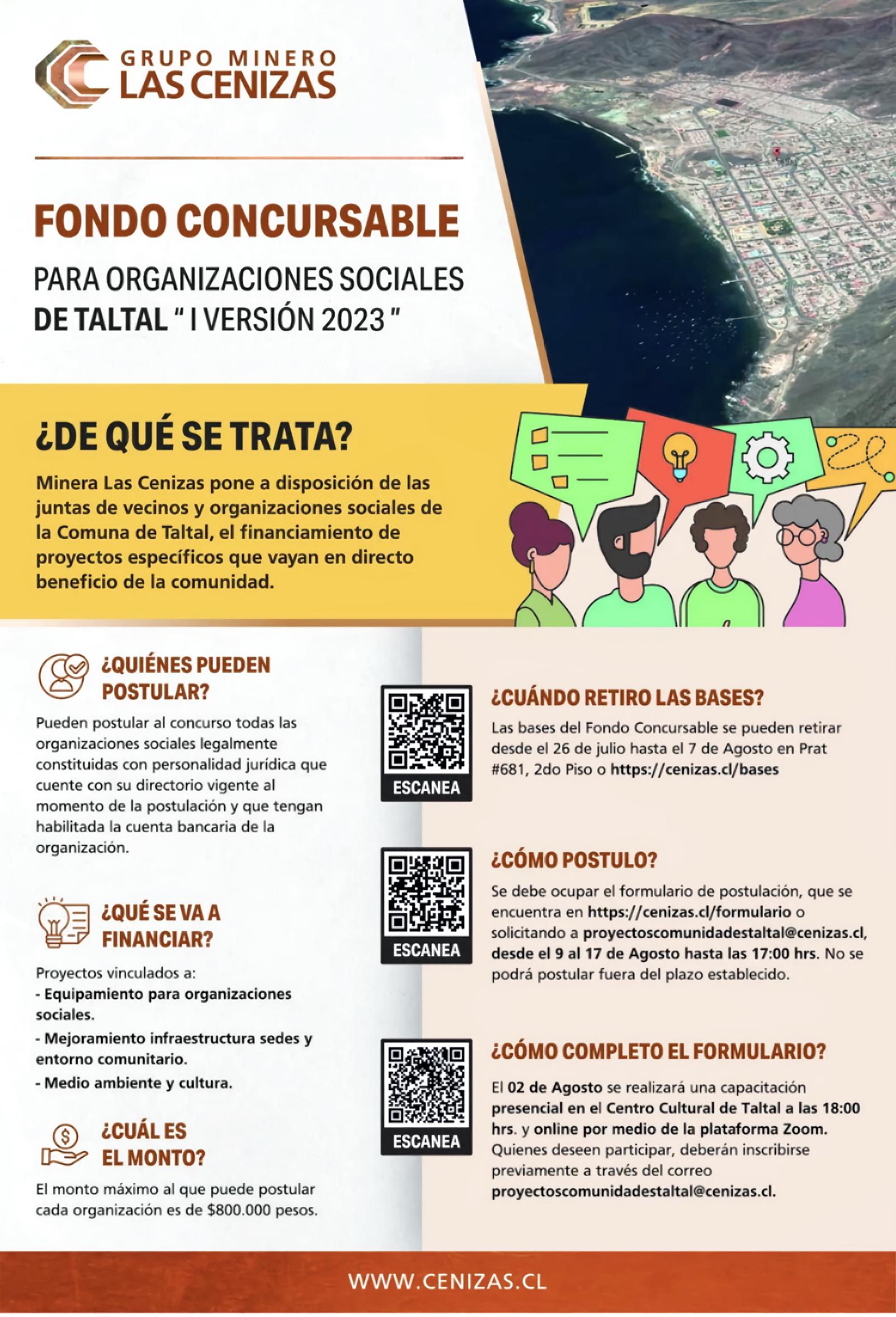 - El 02 de Agosto se realizará una capacitación presencial en el Centro Cultural de Taltal a las 18:00 hrs. y online por medio de la plataforma Zoom. Quienes deseen participar, deberán inscribirse previamente a través del correo “proyectoscomunidadestaltal@cenizas.cl”,