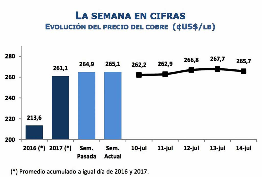 - Hoy el precio del cobre registró un alza de 0,8% respecto al viernes pasado, situándose en US$ 2,66 la libra. La tendencia al alza semanal fue inducida por las últimas declaraciones de la presidenta de la FED de donde se dedujo una mayor gradualidad en el programa de normalización monetaria, visión que se fortaleció por la debilidad de la inflación de junio. En tanto en China los favorables indicadores de comercio exterior y una política fiscal expansiva han acotado el riesgo asociado a la restricción crediticia.