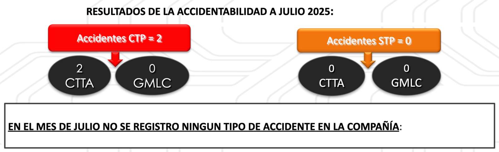 - En el mes de julio no se registró ningún tipo de accidente en la Compañía gracias al compromiso preventivo y disciplina en el cumplimiento de los procedimientos de trabajos, reglamentos y herramientas preventivas por parte de todos los trabajadores directos y colaboradores de la Compañía.
