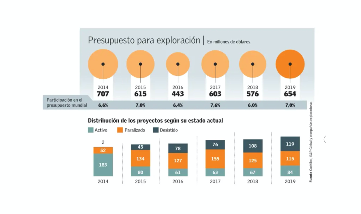 La nota de alerta tiene que ver con que solo un 26% de los 318 proyectos catastrado reportó avances en sus proyectos, dentro de los que se incluyen nuevas estimaciones de recursos y reservas, avances en estudios de factibilidad o prefactibilidad, DIA o EIA, actividades de exploración como mapeos, muestreos, perforaciones, entre otros.