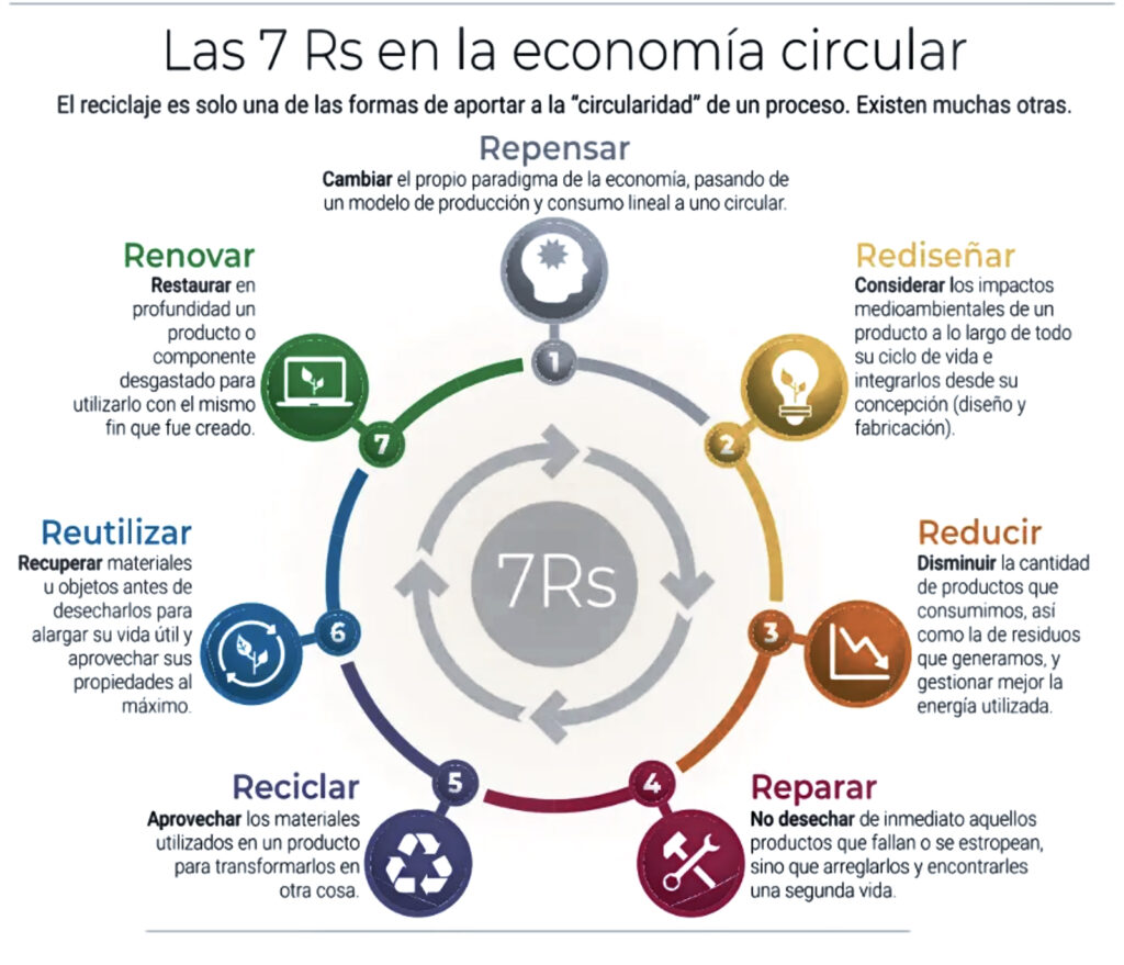 Es una manera distinta de mirar los productos y materiales, transitando de un sistema económico lineal -basado en el hacer, usar y desechar- hacia otro que permita el aprovechamiento y uso eficiente de los recursos, manteniéndolos en circulación -por medio del reciclaje, reutilización, reparación y remanufactura- durante el mayor tiempo posible.