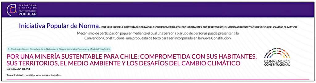 En el marco de las Iniciativas Populares de Norma (IPN) que buscan recoger inquietudes y necesidades de la sociedad civil para ser incluidas en la Convención Constituyente, Compromiso Minero que reúne a las principales empresas de la gran y mediana minería de Chile, está buscando 15 mil firmas para su Iniciativa Popular de Norma “POR UNA MINERÍA SUSTENTABLE PARA CHILE: COMPROMETIDA CON SUS HABITANTES, SUS TERRITORIOS, EL MEDIO AMBIENTE Y LOS DESAFÍOS DEL CAMBIO CLIMÁTICO”.