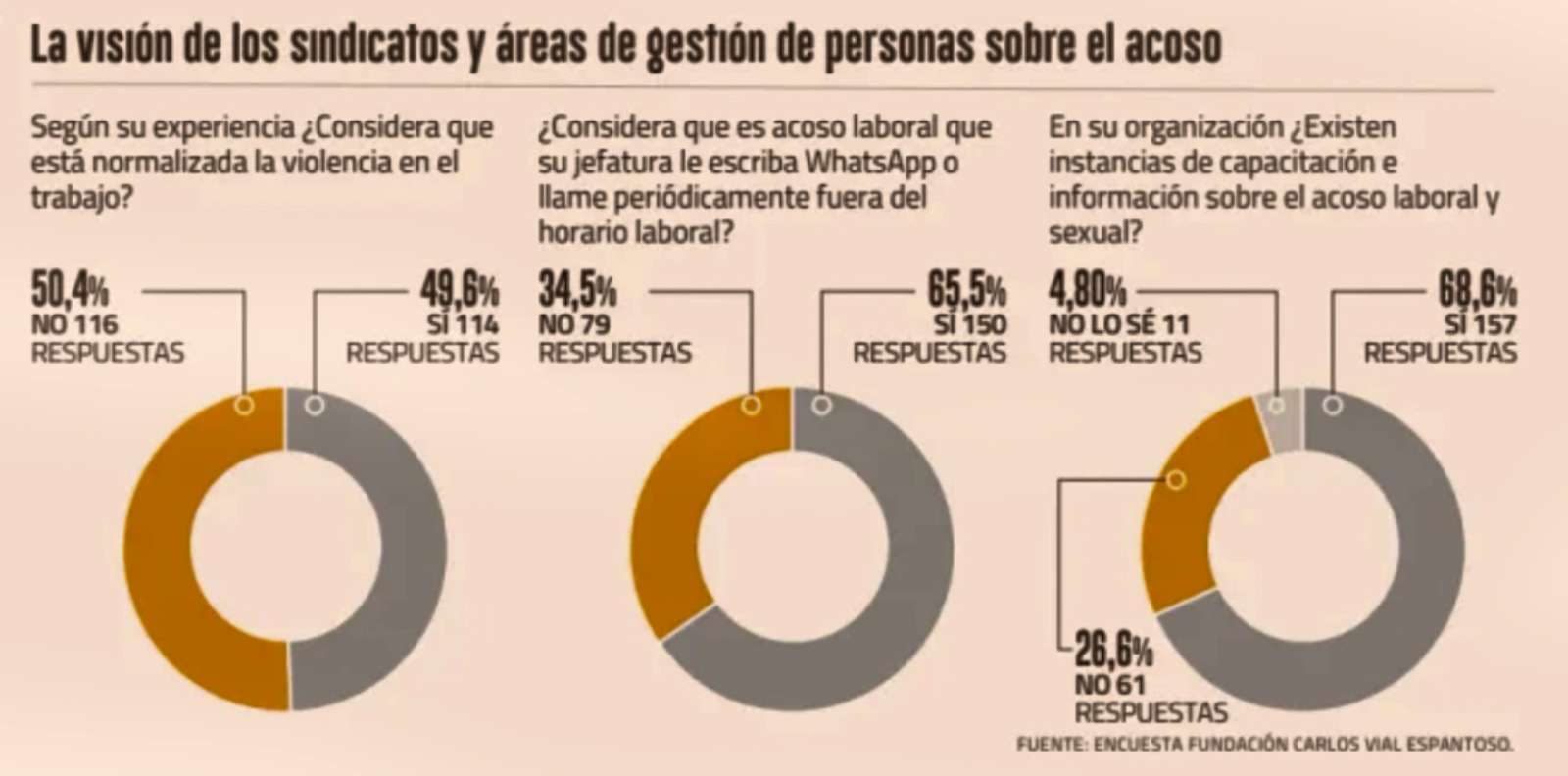 - Encuesta realizada por la Fundación Carlos Vial Espantoso durante el “Encuentro de Diálogo Ley Karin en marcha: un enfoque práctico”, que involucró a 230 personas, incluyendo dirigentes sindicales, gerentes y equipos de gestión de personas, reveló importantes opiniones a considerar.