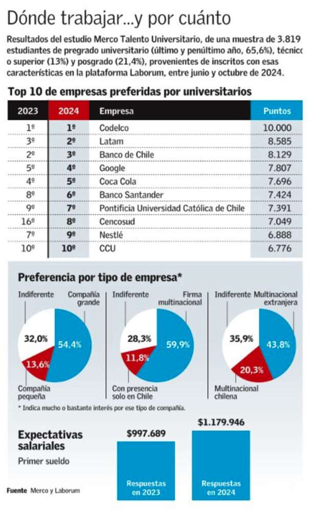 El 54% de los estudiantes prefiere trabajar en grandes empresas, y un 60% optaría por una multinacional (chilena o extranjera).