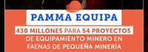 54 iniciativas de equipamiento minero entre las regiones de Arica y Parinacota y Los Ríos, que postularon este año al fondo concursable PAMMA Equipa 2024, recibirán recursos para el financiamiento y adquisición de equipamiento básico, contenedores/containers, herramientas de trabajo, kit de seguridad y accesorios que favorecen un mejor desempeño de la actividad del sector.