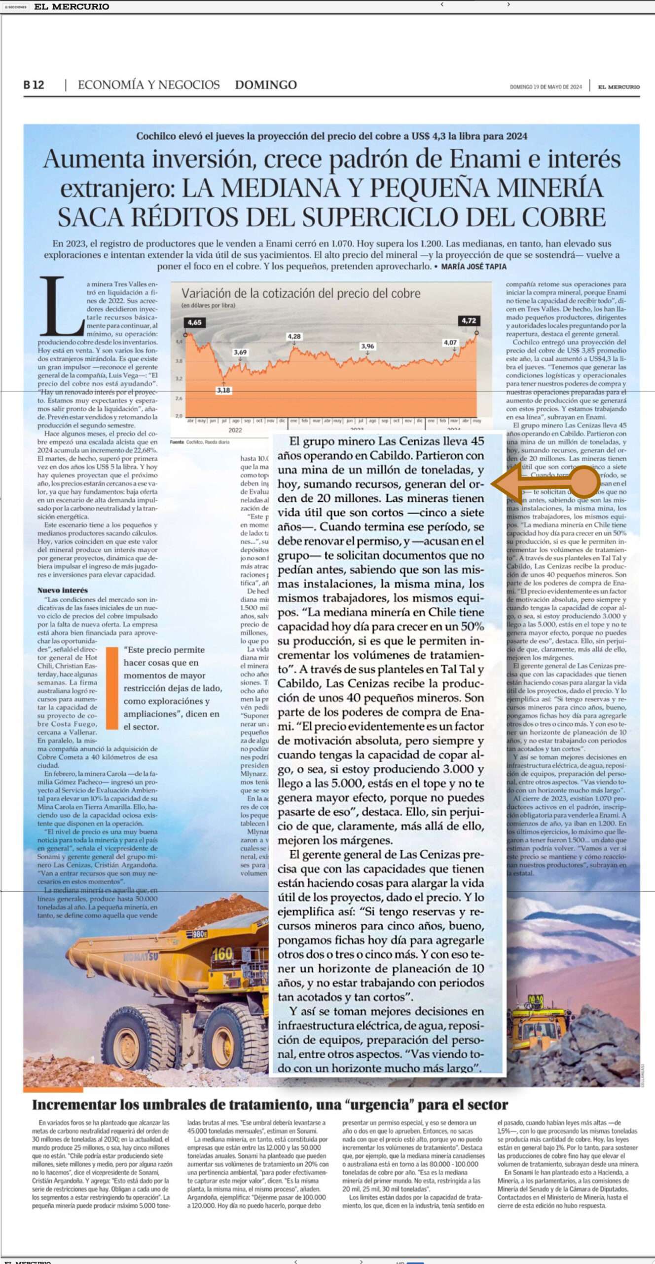 - De acuerdo a la opinión de ejecutivos y representantes de la mediana y pequeña minería, entrevistados por un medio de comunicación, el incremento en el precio del cobre ha generado un creciente interés nacional e internacional por invertir en el sector.