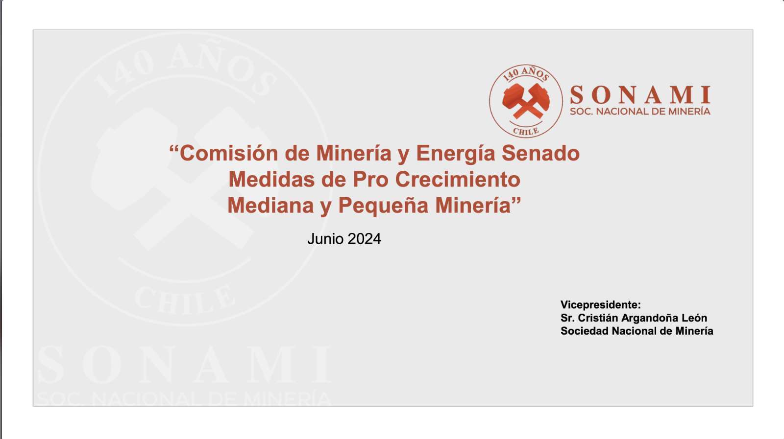 - Los vicepresidentes de Sonami, Cristián Argandoña y Patricio Céspedes, reiteraron ante la Comisión de Minería y Energía del Senado la necesidad de mejorar la competitividad y sostenibilidad de la pequeña y mediana minería y facilitar la operación y expansión de los proyectos mineros en ambos segmentos de la industria.