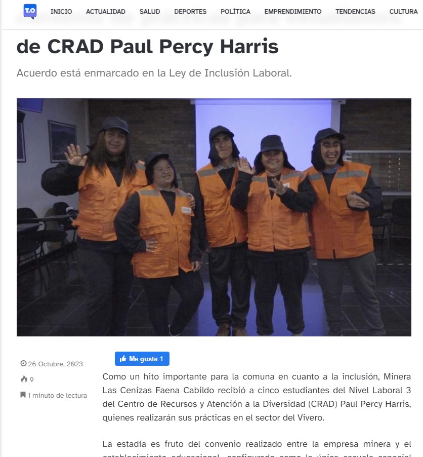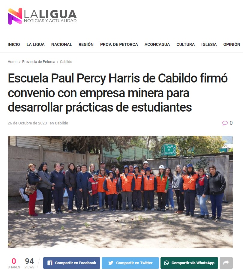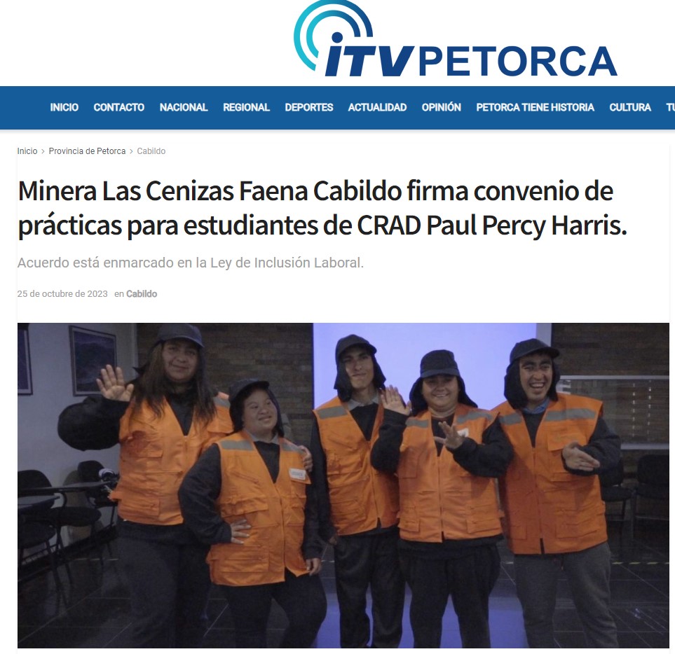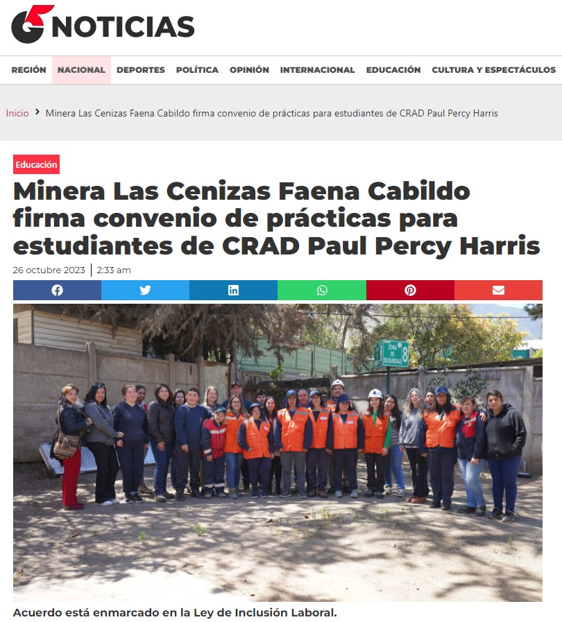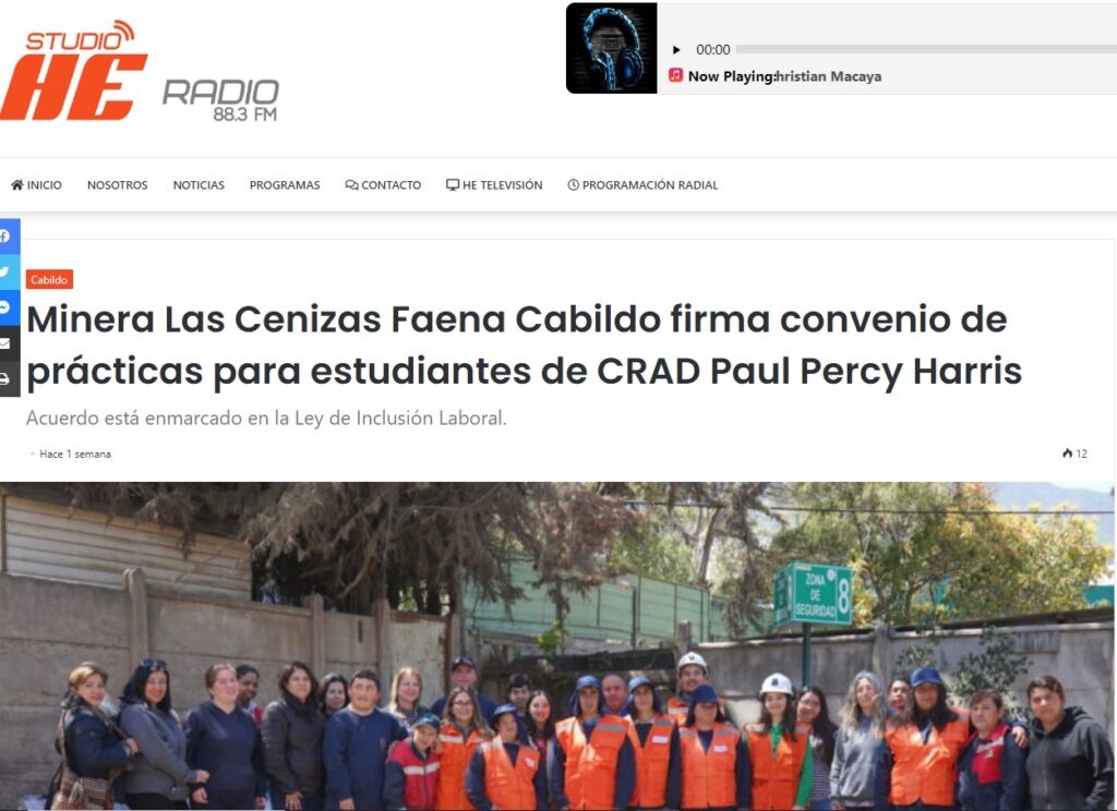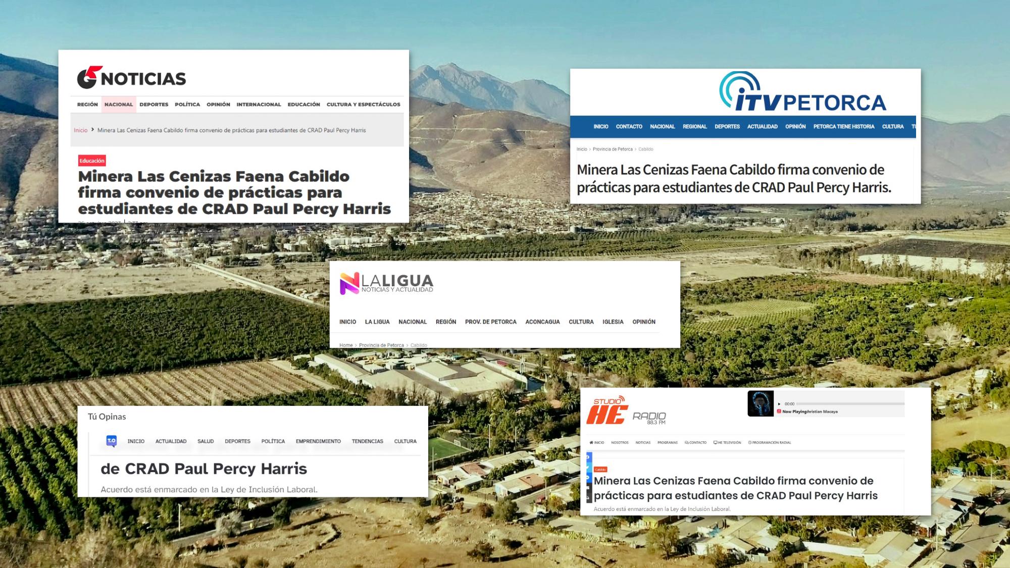 - Diversos medios, tanto con alcance provincial como regional destacaron la firma del convenio de prácticas realizada por Minera Las Cenizas Faena Cabildo con el Centros de Reparación Especializada de Administración Directa (CREAD) Paul Percy Harris.