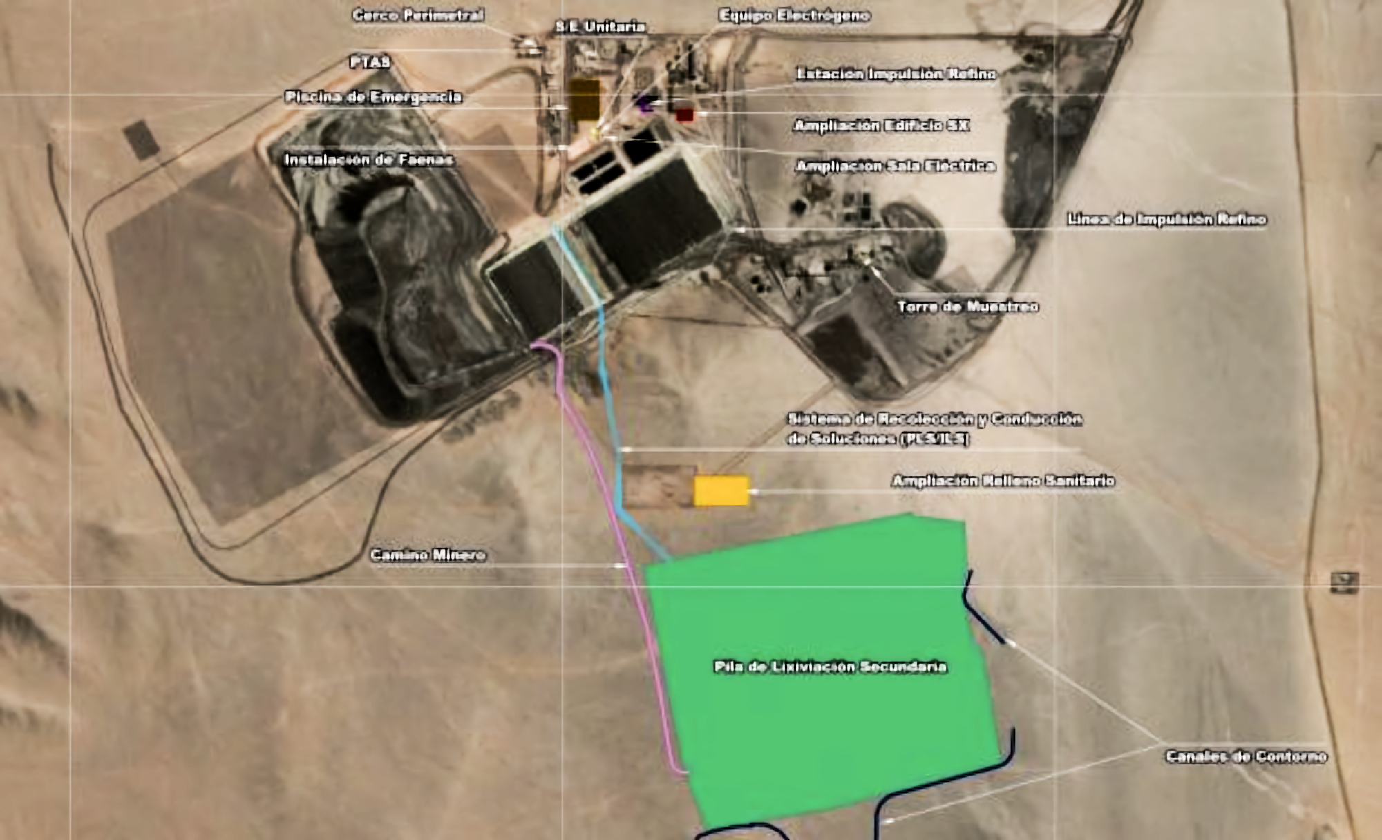 Para el perfecto funcionamiento de la pila de lixiviación secundaria, se proyecta una serie de obras complementarias, tales como, canales de contorno; un sistema de recolección y conducción de soluciones (PLS/ILS); un sistema de impulsión de refino; una nueva piscina de emergencia; instalaciones eléctricas y un camino de acceso minero. Además, se considera la ampliación del edificio SX y del relleno sanitario, una torre de muestreo en el área de chancado, una instalación de faenas y una planta de tratamiento de aguas servidas (PTAS).